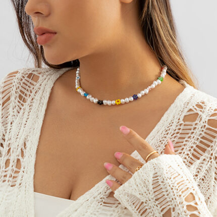 Bohemian Ethnic Beaded Pearl Choker Glass Flower Necklace