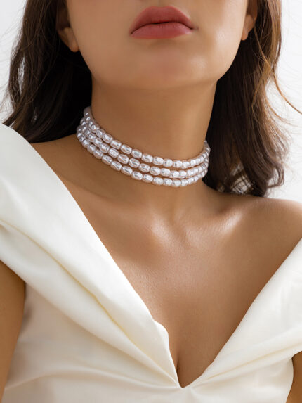 Vintage Multilayer Layer Baroque Pearl Choker Necklaces for Women Elegant White Bead Short Clavicle Chain Jewelry Set