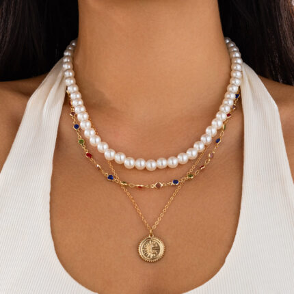 New Fashion Pearl Bead Multi-layer Necklace Simple Round Piece Alloy Pendant Collarbone Chain