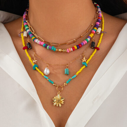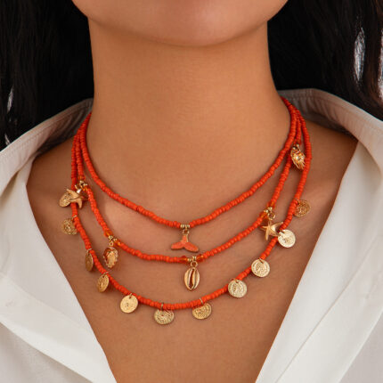 Bohemian Mermaid Tassel Multi-Layered Colorful Shell Pendant Necklace Set Rice Beads Multi-Layered Collarbone Chain