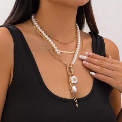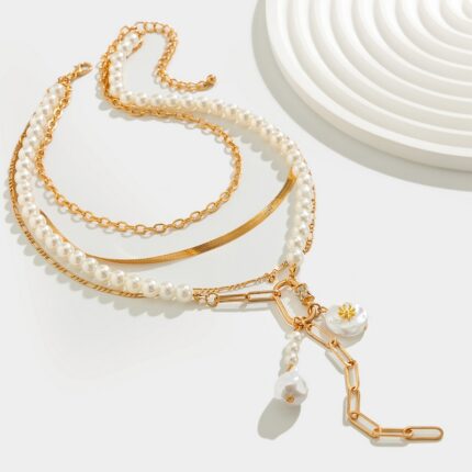 New Fashion Sense Multi-layer Shaped Pearl Necklace Casual Style Alloy Flat Snake Chain Lockbone Chain