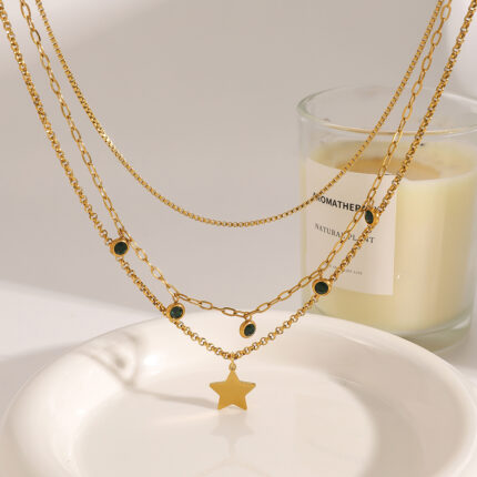 Fashion 18K Gold Stacked Stainless Steel Delicate Crystal Necklace Waterproof Green Zirconia Necklace