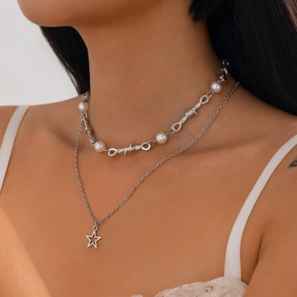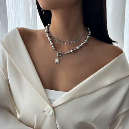 Ins Style Pentagram Alloy Pendant Collarbone Chain Fashion Pearl Multi-layer Necklace New Star of David Necklace