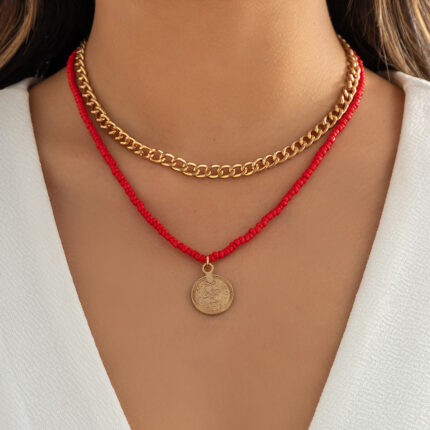 Sweet Grace Cool Style Rice-Shaped Beads Stringed Beads Necklace Clavicle Chain Girl Gold Coin Pendant Necklace Hot Girl