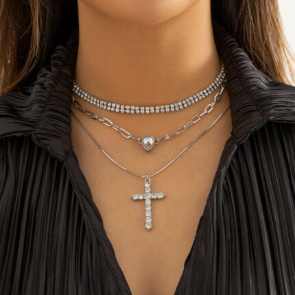 Hip Hop Full Diamond Cross Necklace Metal Zircon Necklace Punk Drop Pendant Diamond Necklace