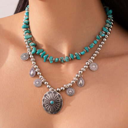 Ethnic Style Metal Floral Round Piece Necklace Vintage Turquoise CCB Beaded Choker Chain for Women