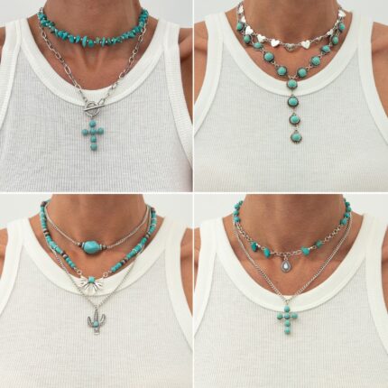 New Turquoise Pendant Necklace Punk Alloy Stacking Beaded Turquoise Cross Necklace