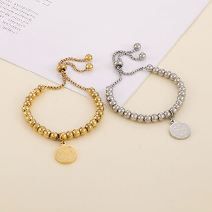 Simple 18K Real Gold-Plated Stainless Steel Beaded Round Coin Bracelet Adjustable Titanium Steel Women’s Bracelet