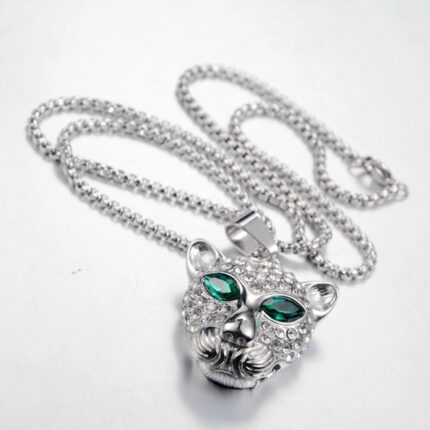 Hip Hop Fashion Personalized Green Eye Drilling Leopard Head Titanium Steel Necklace Charms for Men and Women