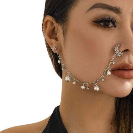 New Ethnic Style Star and Moon Tassel Pierced Nose Pillar Nose Jewelry Retro Star Pearl Earrings Nose Ring