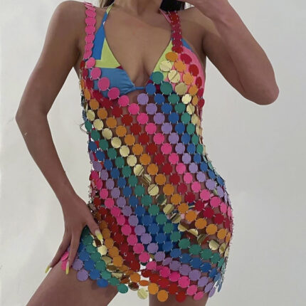 Colorful Rainbow Round Sequins Harness Bra Chest Neck Body Chain Sexy Summer Beach Bikini Dress Women Body Jewelry