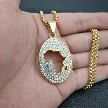 Top Quality Custom Gold Plated Iced Out Rhinestone Crystal Stainless Steel Hollow African Map Pendant Necklace