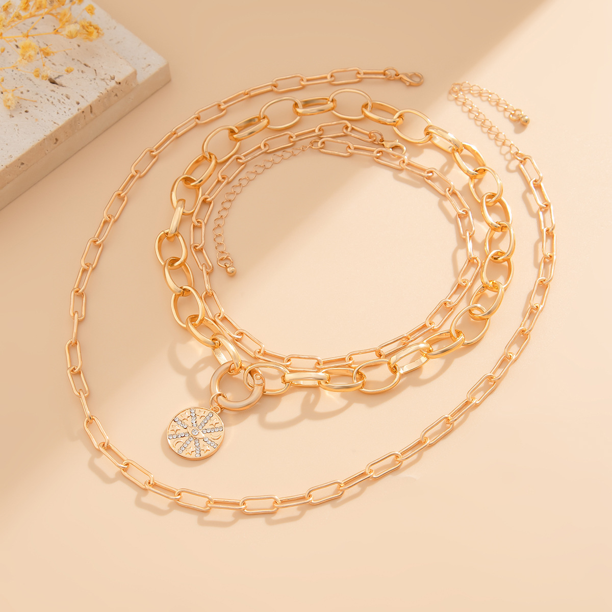 Home Necklace 3 Piece Hip Hop Style Alloy Cuban Necklace Round Piece Spring Clasp Choke Chain Set