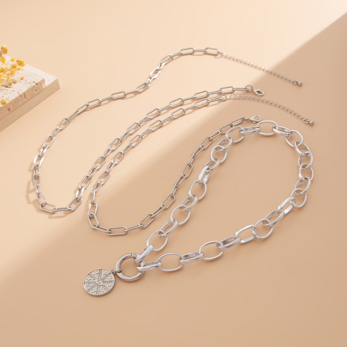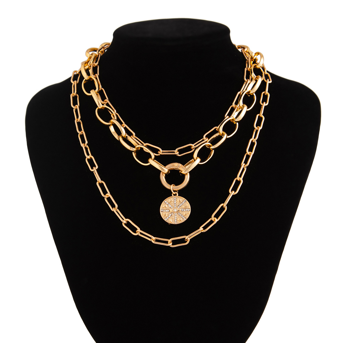 Home Necklace 3 Piece Hip Hop Style Alloy Cuban Necklace Round Piece Spring Clasp Choke Chain Set