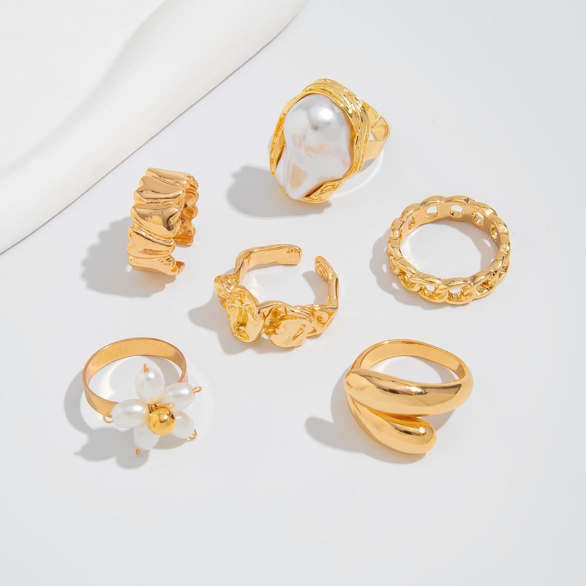 Home Ring Baroque Irregular Wave Metal Ring Set Openwork Pleated Pearl Flower Rings set