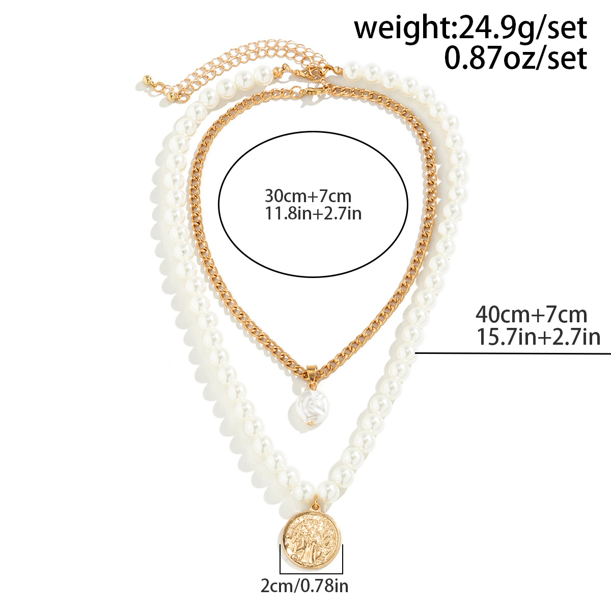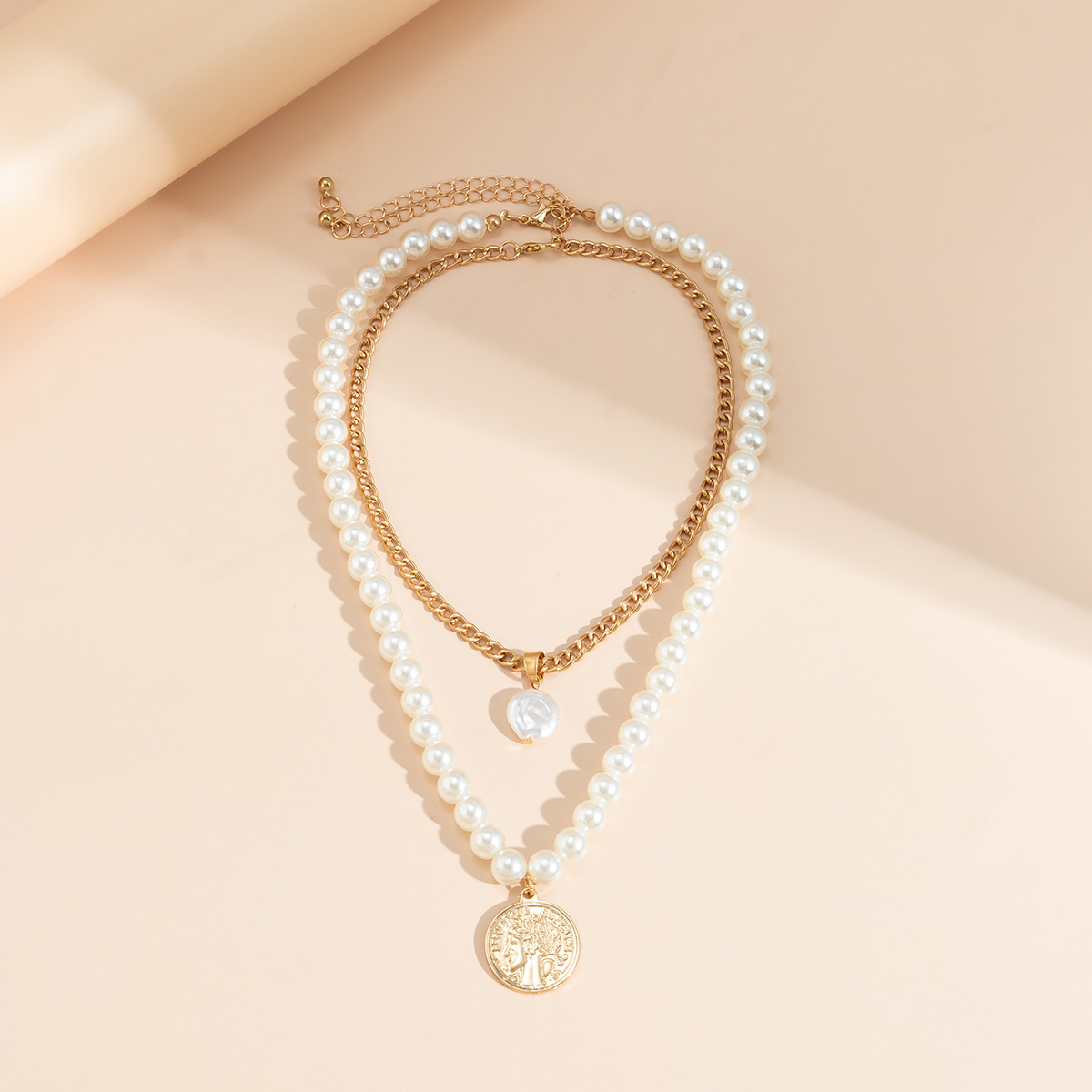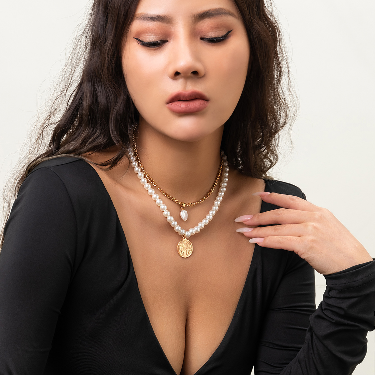 Home Necklace Hip Hop Multi-Layer Necklace Fashion Pearl Necklace Light Luxury Geometric Relief Portrait Pendant Female Necklace