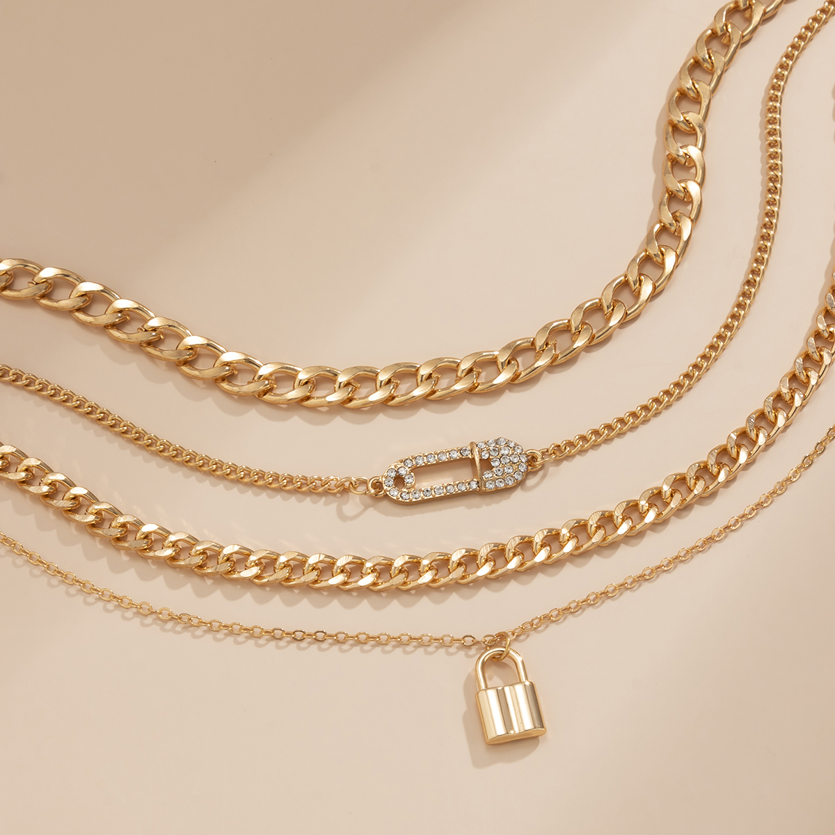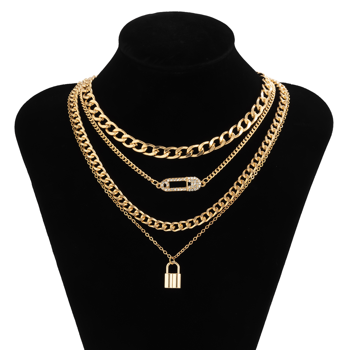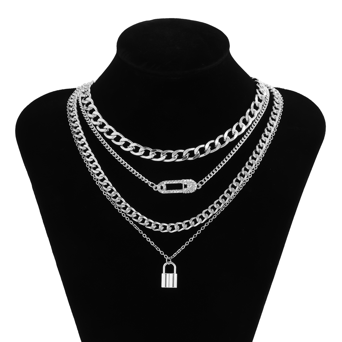 Home Necklace Multi element Rhinestone Pins Set Necklace Mixed with Punk Style Geometric Alloy Lock and Chain Necklace
