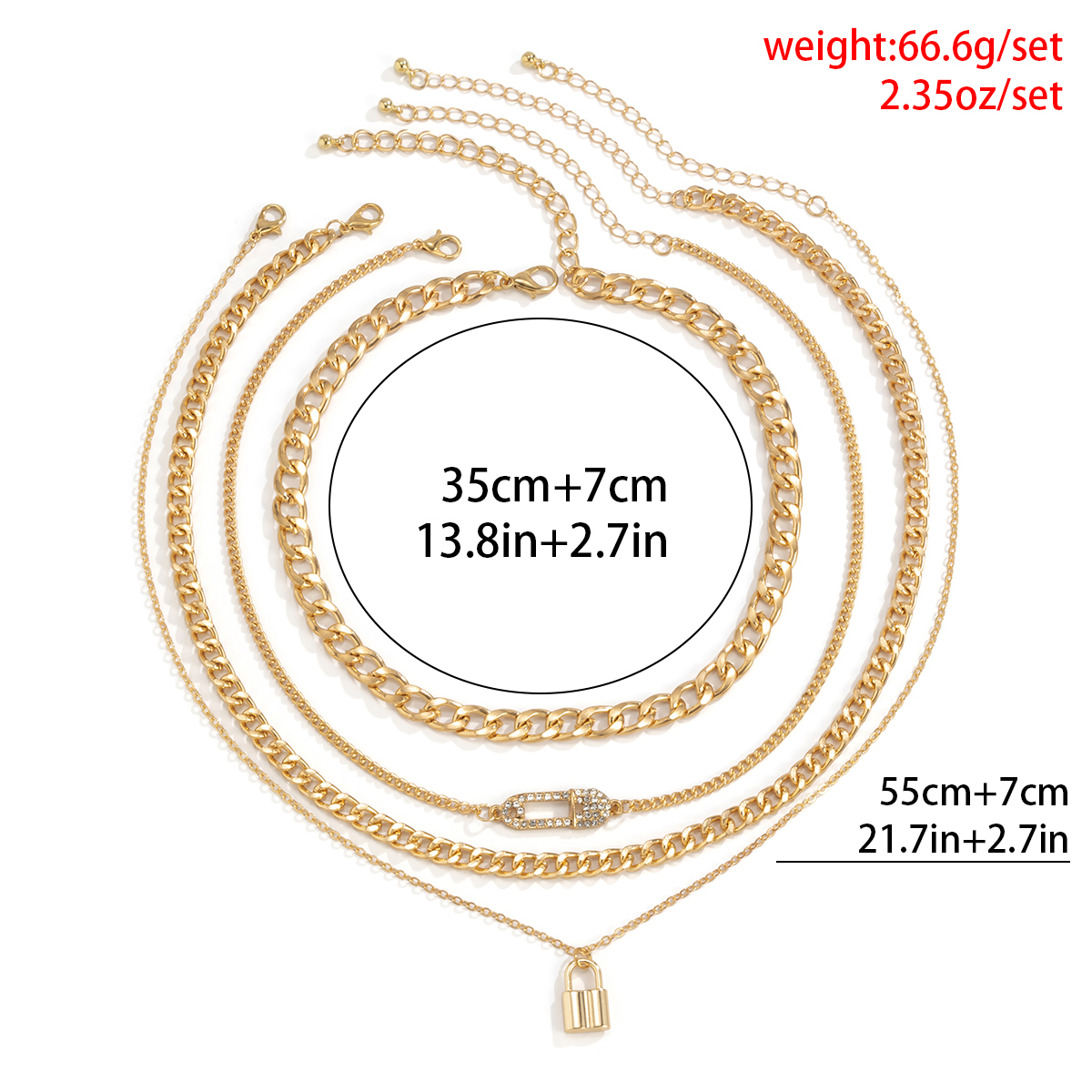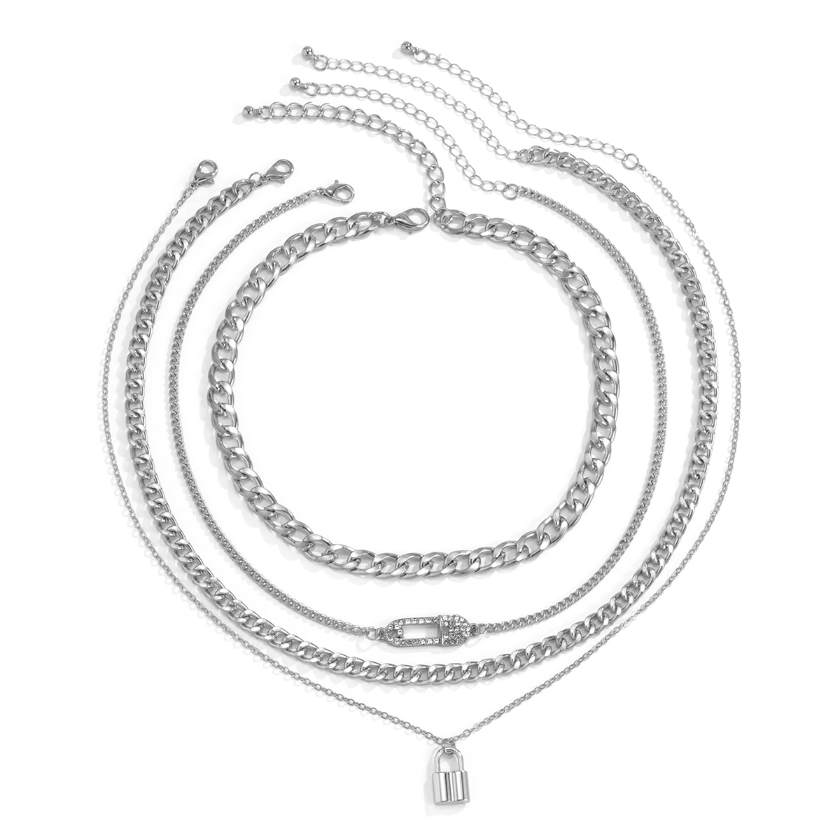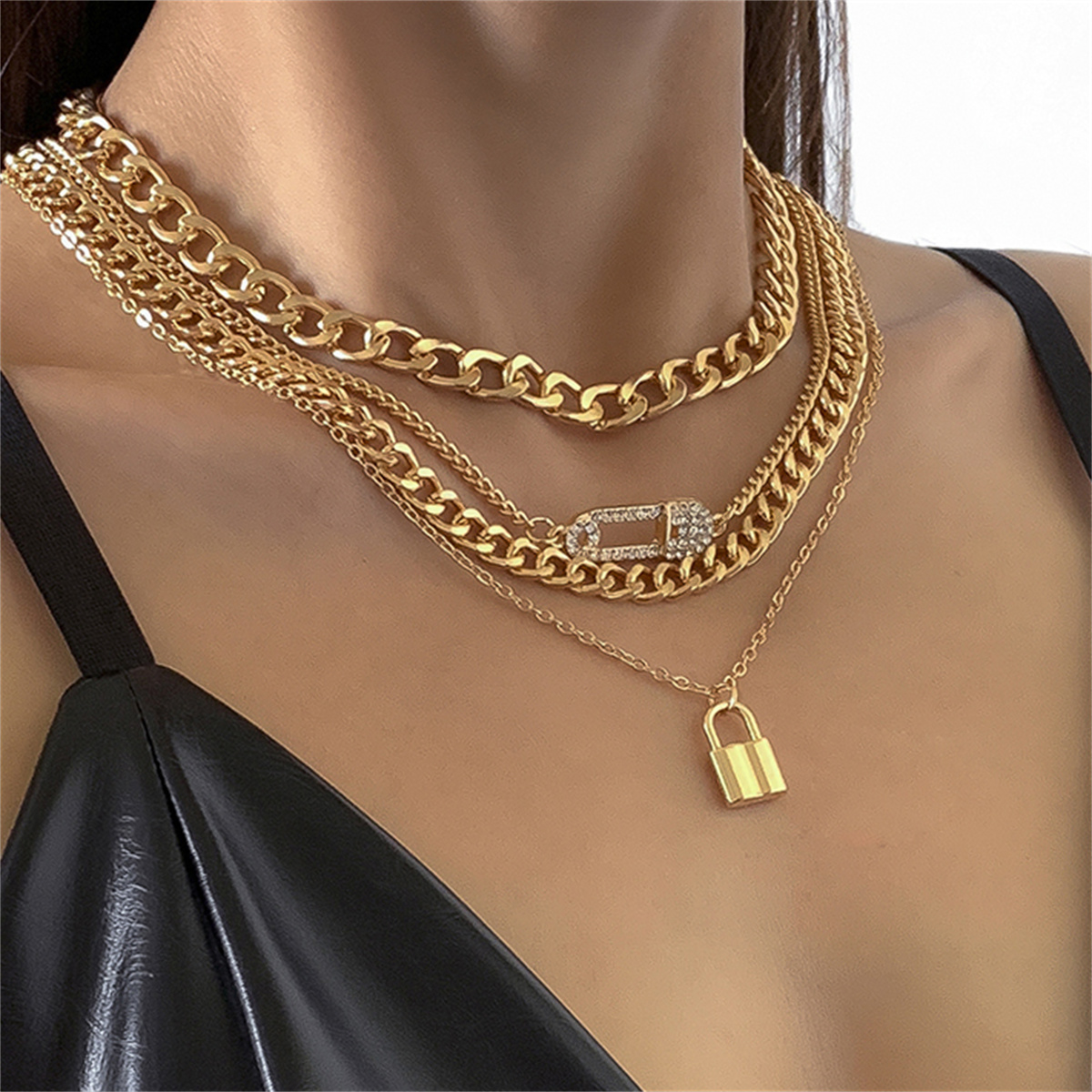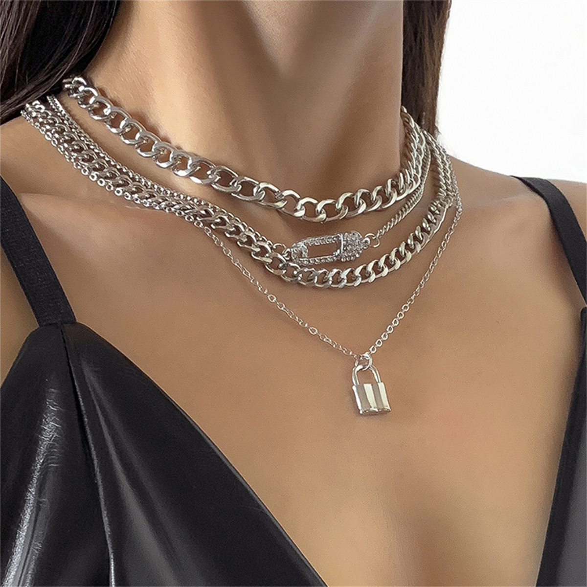 Home Necklace Multi element Rhinestone Pins Set Necklace Mixed with Punk Style Geometric Alloy Lock and Chain Necklace