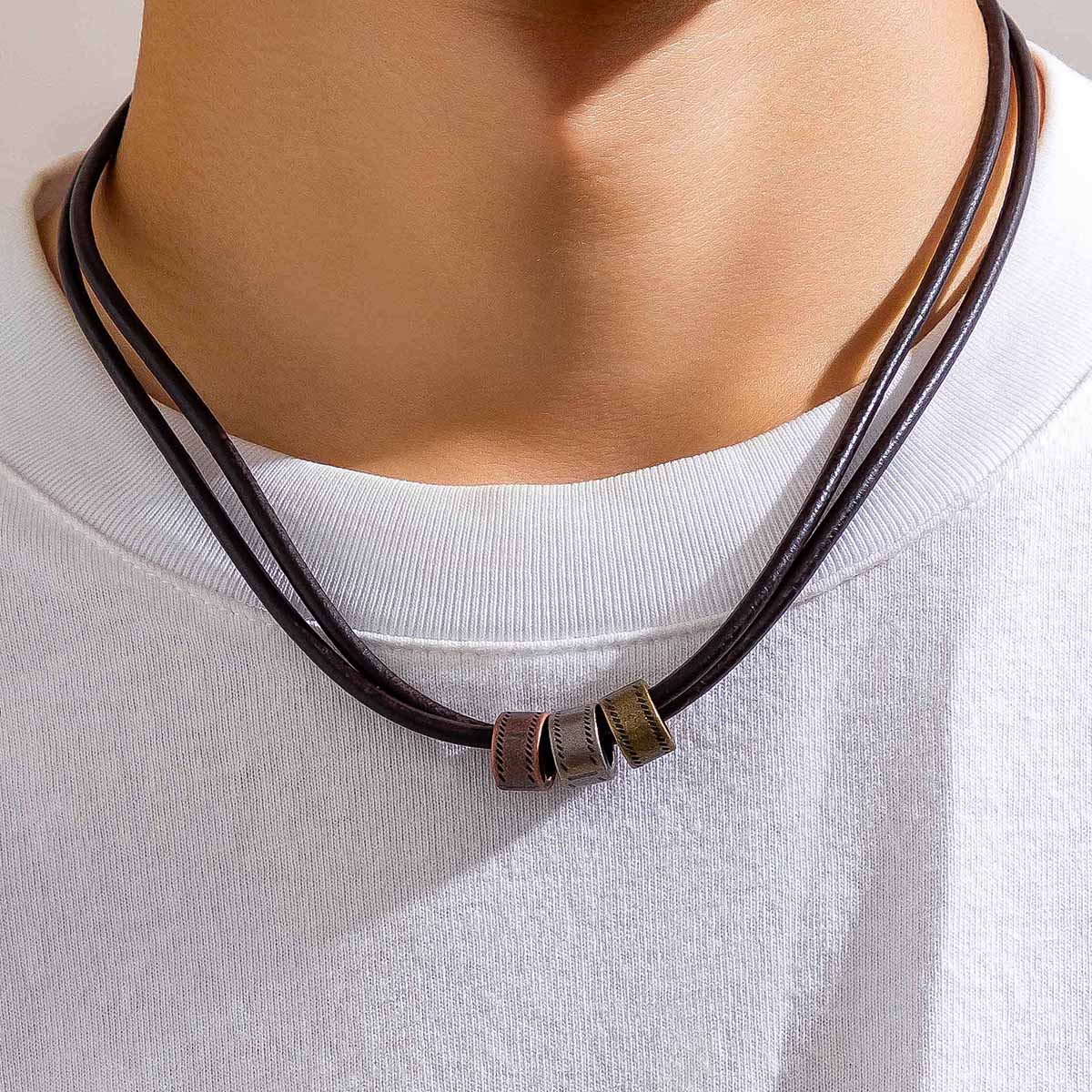 Home Necklace New Punk Cylinder Beads Men’s Charm Necklace PU Leather Strap with Necklace Hip Hop Jewelry