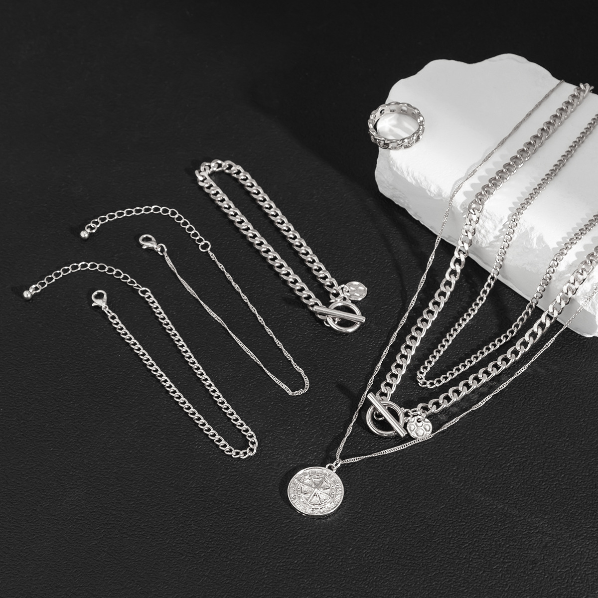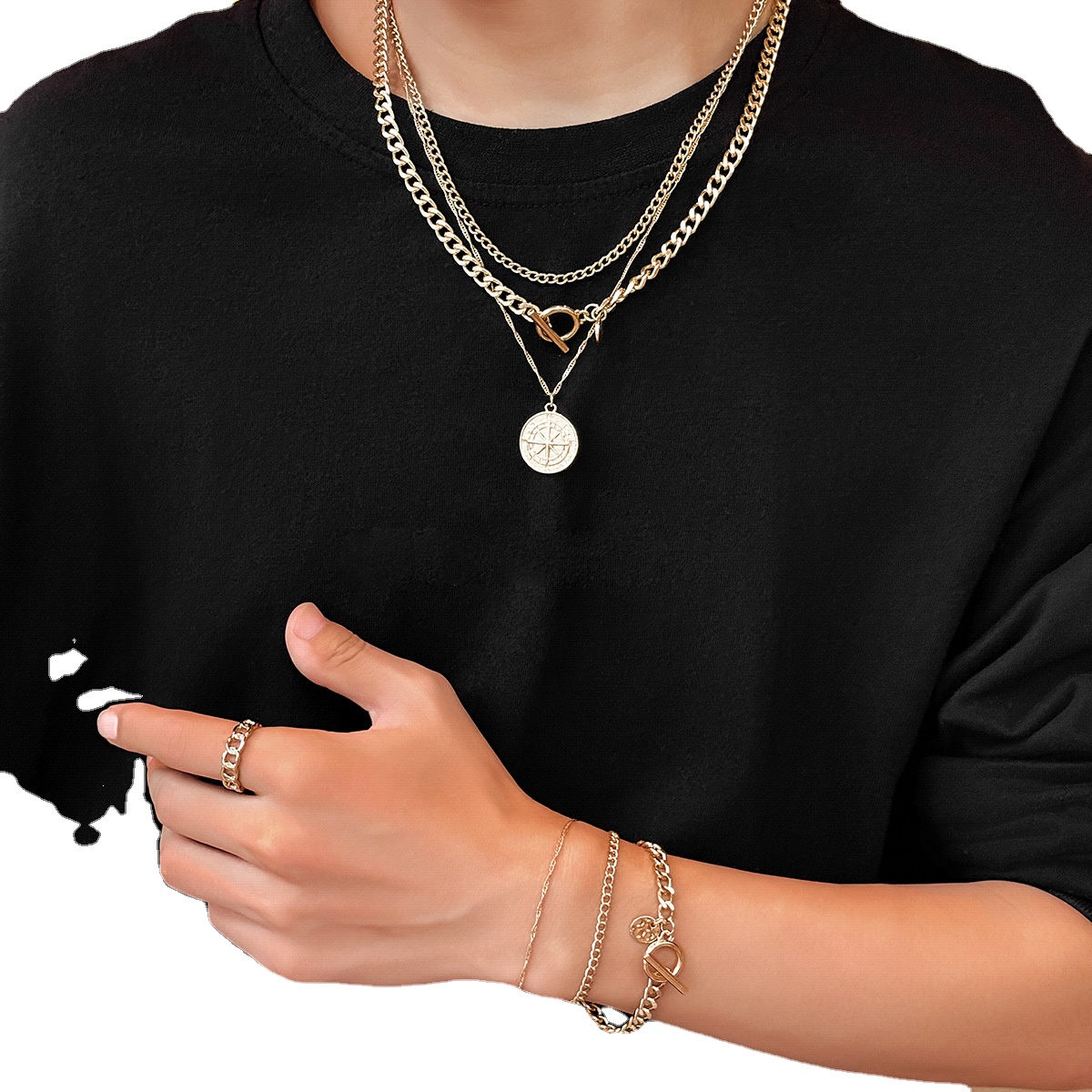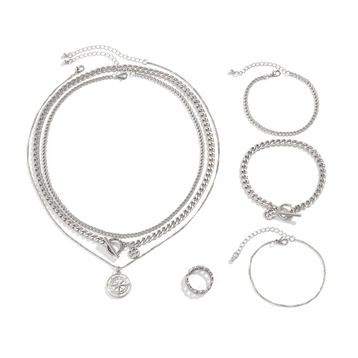 Home Necklace Personalized Compass Pendant OT Buckle Men’s Necklace Ring Bracelet Three-piece Punk Style Retro Fashion