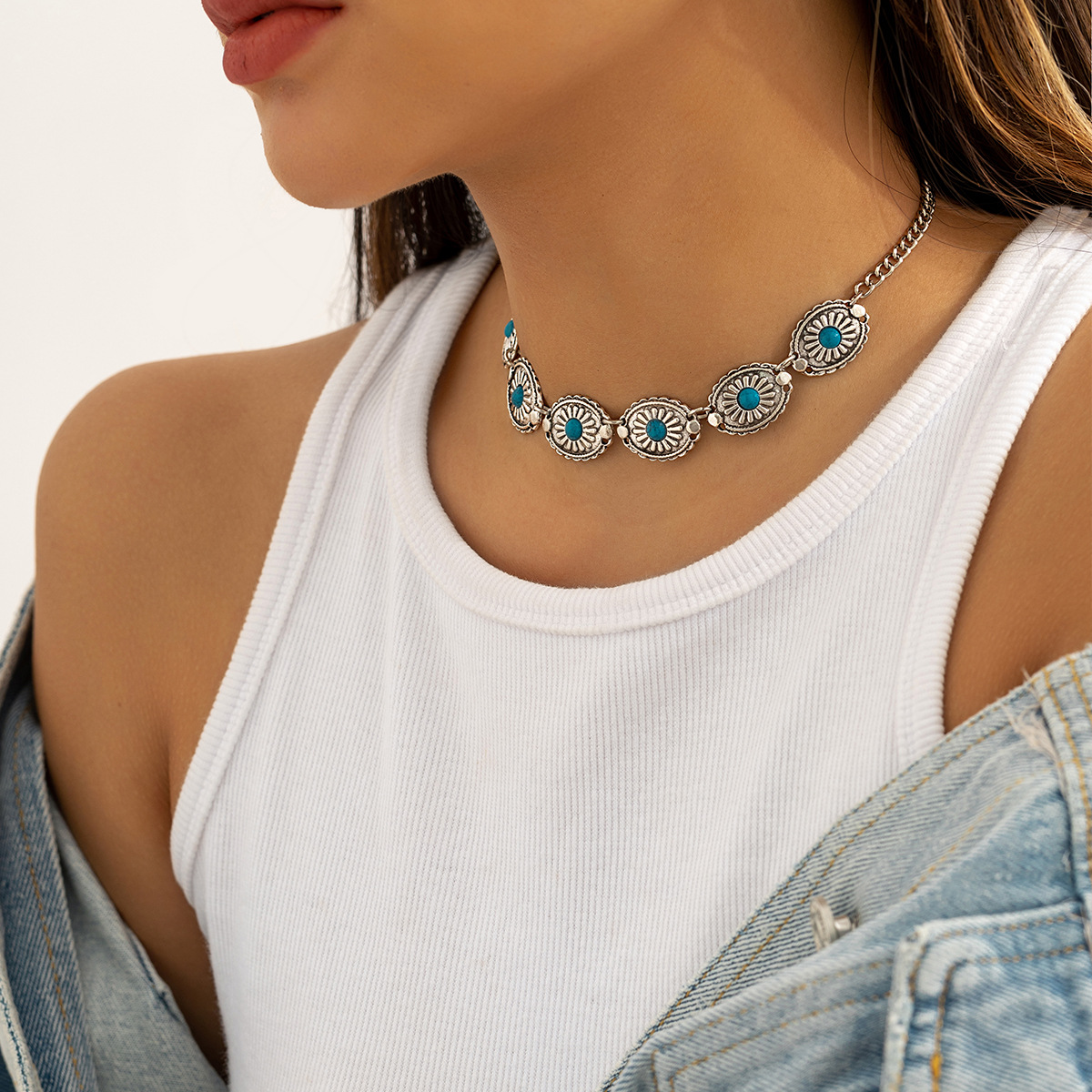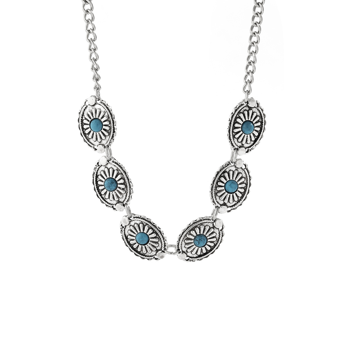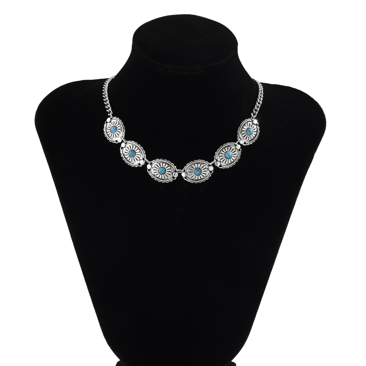 Home Necklace Retro Turquoise Jewelry Bohemian Ethnic Fashion Metal Necklace Squash Blossom Turquoise Necklace Neck Accessories